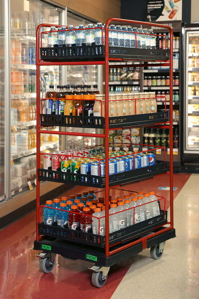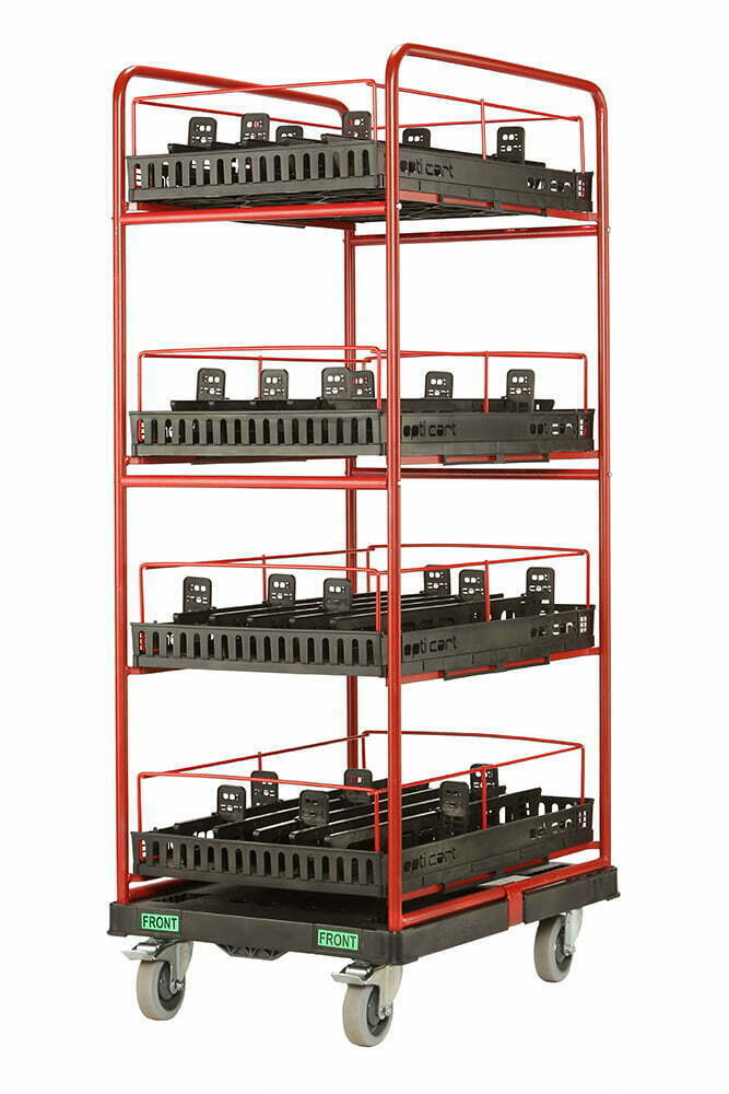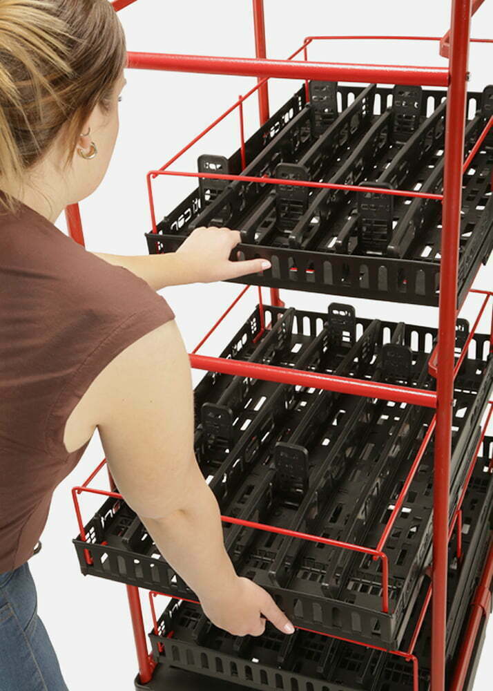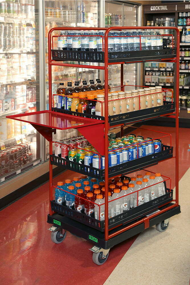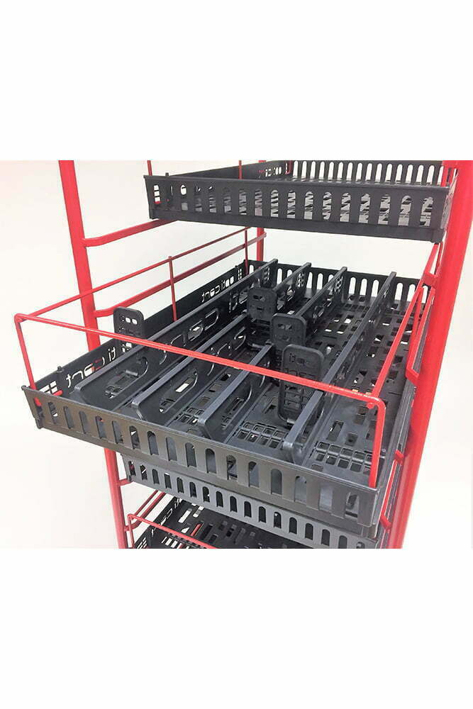 CHARIOT POUR TOUS TYPES DE CONTENANT À BOIRE. Avec ses quatre tiroirs, ses 20 diviseurs, 20 stoppers et ses quatre ridelles de protection, le DK-BREUVAGE4 est idéal pour le transport de tout breuvage de différentes dimensions.